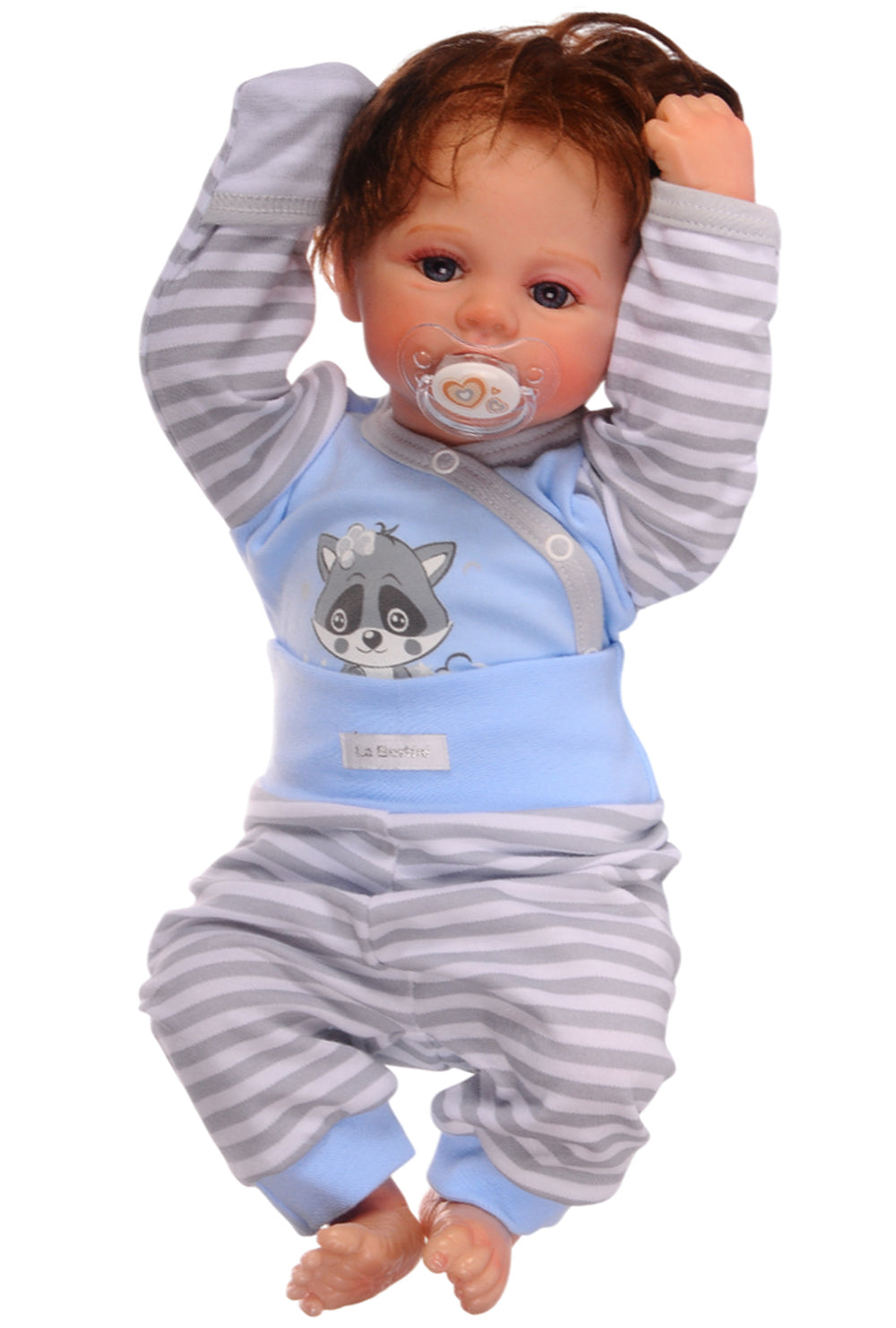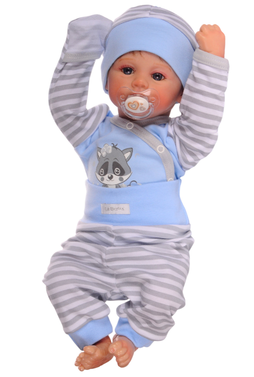 Baby Anzug Wickelbody Hose Mütze in Blau mit Waschbär