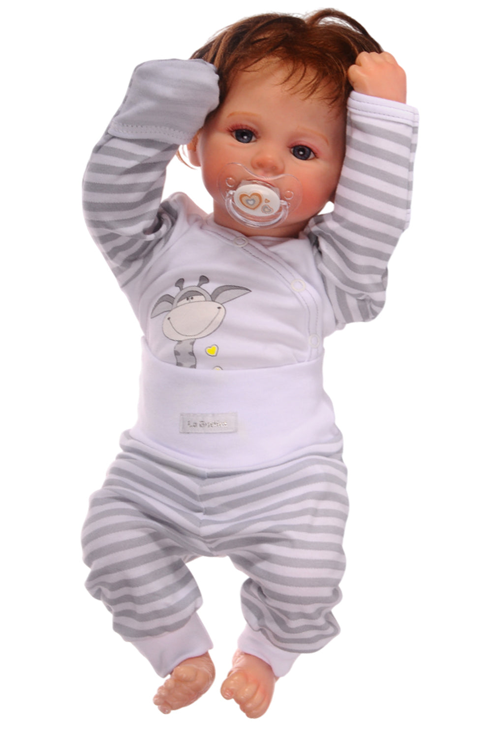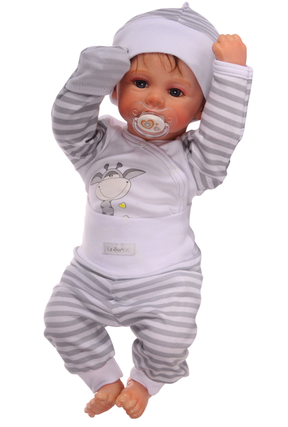 Dieser 3-teilige Baby-Anzug bietet weichen Tragekomfort und ein liebevolles Design. Er besteht aus einem Wickelbody in Weiß-Grau gestreift mit süßem Giraffen-Aufdruck, einer passenden Hose mit elastischem Bund sowie einer Mütze im gleichen Muster. Alle Teile sind aus reiner, atmungsaktiver Baumwolle gefertigt, während Bund und Bündchen aus 95 % Baumwolle und 5 % Elasthan bestehen – für eine bequeme Passform und optimale Bewegungsfreiheit. Das Set ist ideal für alle Jahreszeiten und eine schöne Geschenkidee zur Geburt.