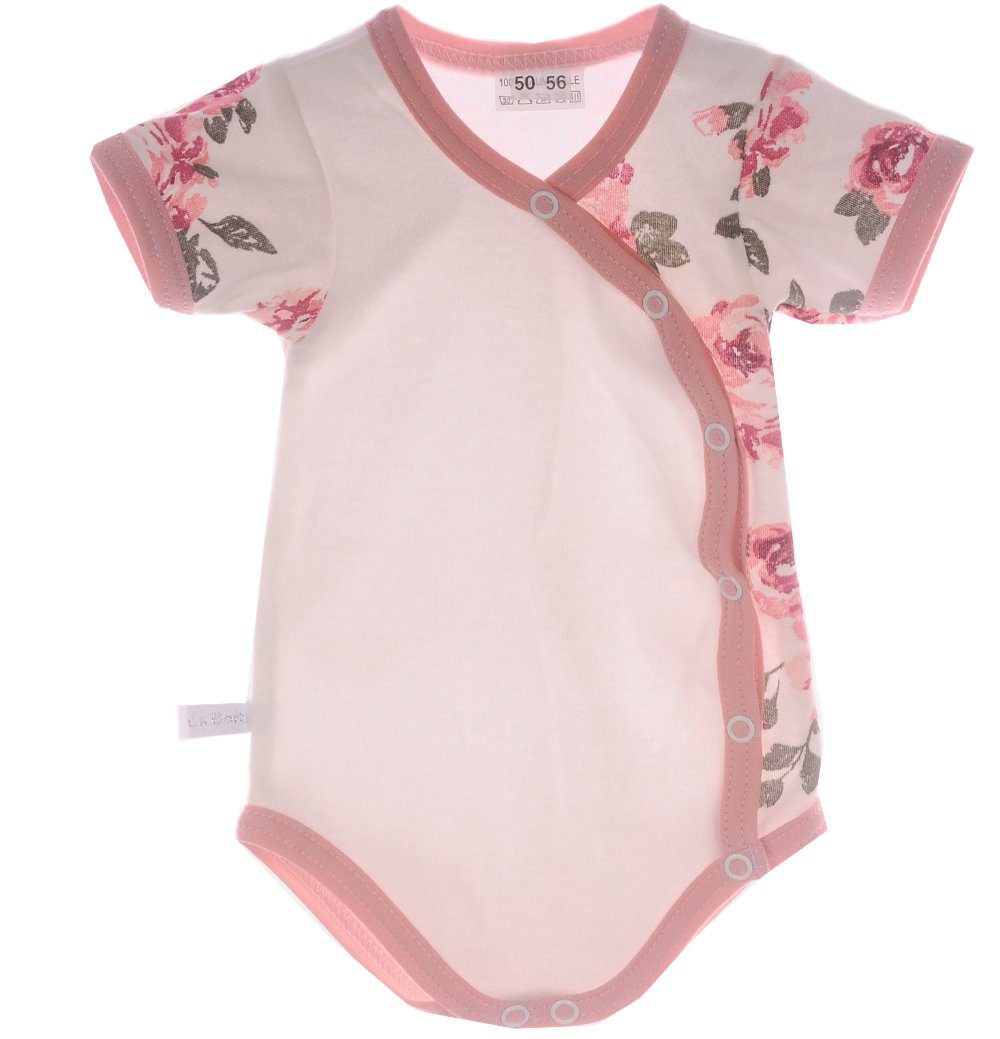 Dieser entzückende Kurzarm-Wickelbody in Creme mit zartem Blumenmuster ist nicht nur praktisch, sondern auch ein echter Hingucker in der Baby-Garderobe. Die Wickeloptik mit seitlich angebrachten Druckknöpfen ermöglicht ein einfaches An- und Ausziehen, ohne dass der Body über den empfindlichen Babykopf gezogen werden muss – besonders angenehm für Neugeborene.