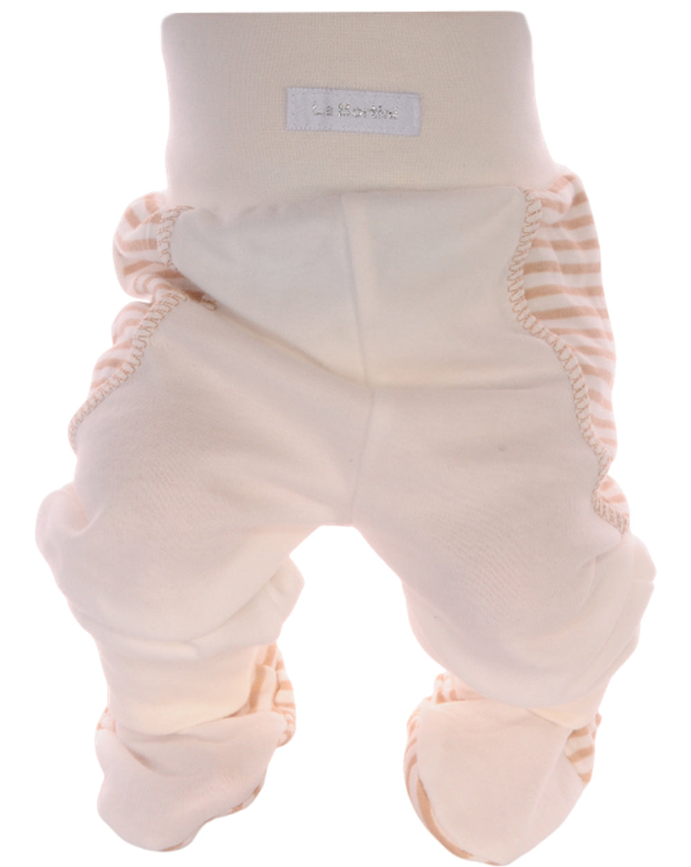 Diese bequeme Babyhose mit Füßchen präsentiert sich in einem sanften Cremeton mit seitlichen Streifen – ein stilvoller und zugleich zeitloser Look für die ersten Lebensmonate. Der weiche, elastische Bund sorgt für einen rundum angenehmen Sitz, ohne Druckstellen zu hinterlassen, und erleichtert das An- und Ausziehen im Alltag. Die integrierten Füßchen halten kleine Babyfüße warm und geborgen – ideal für Neugeborene.