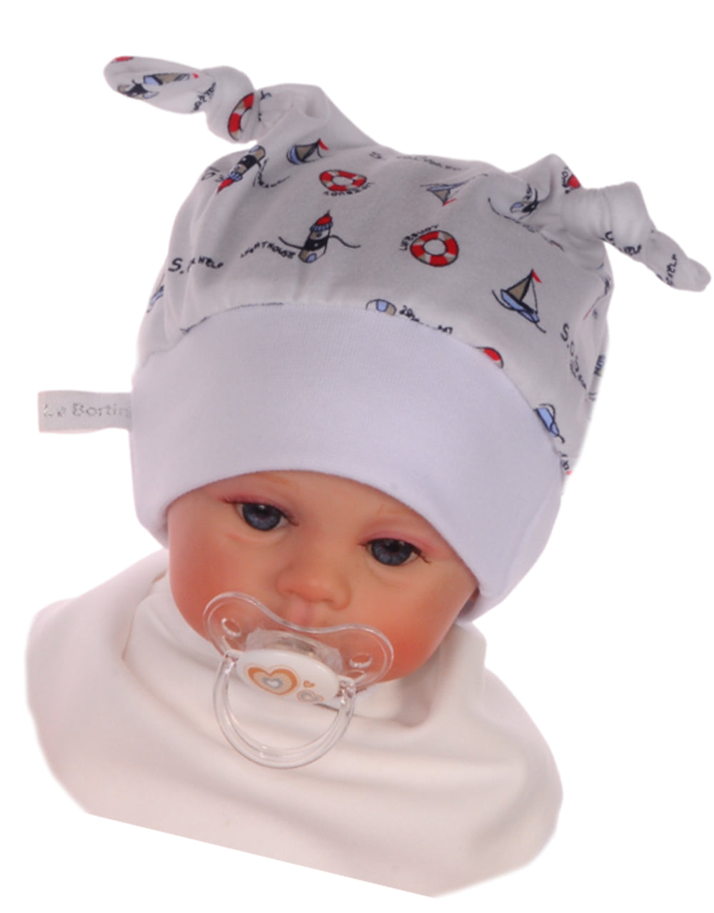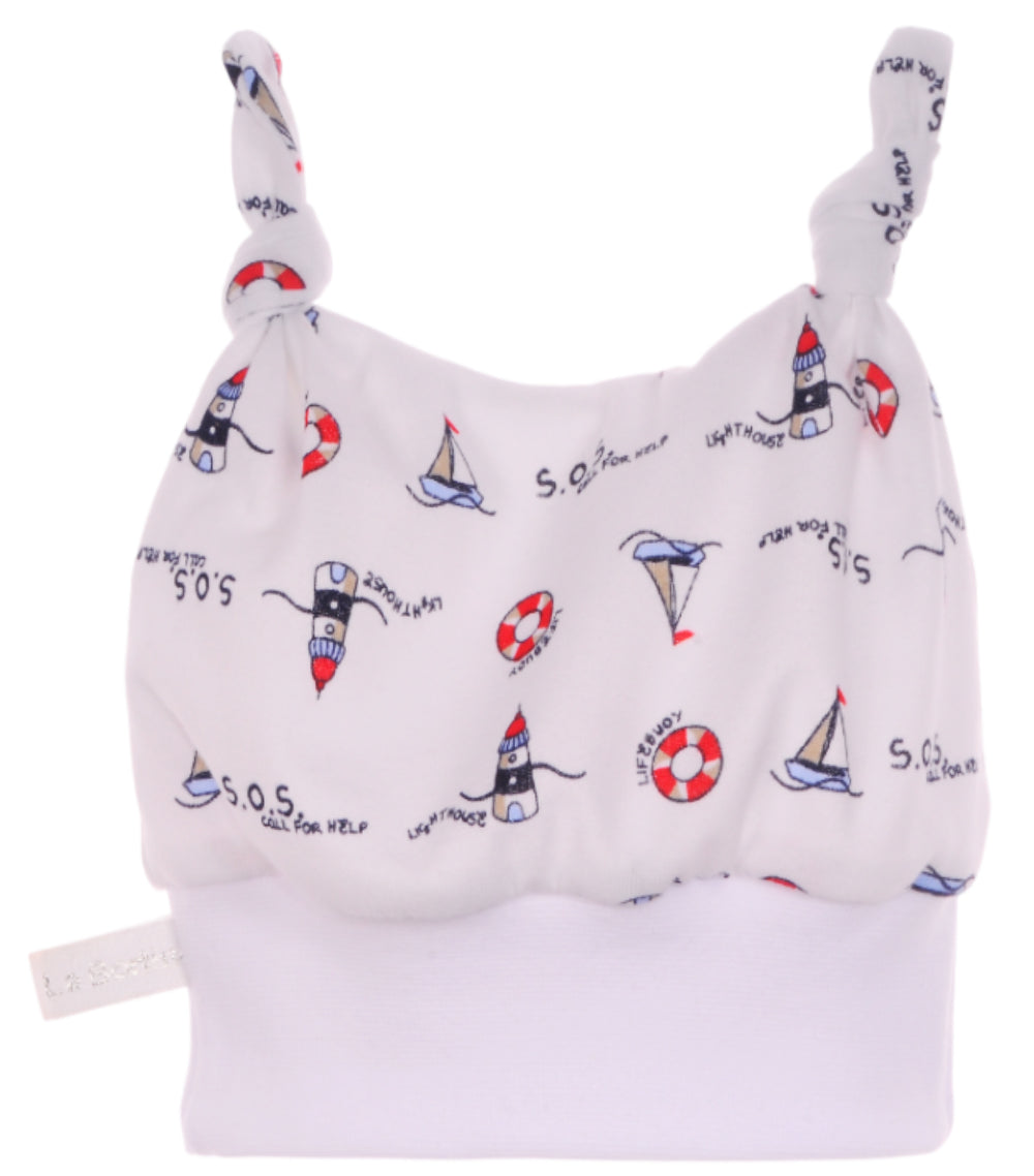 Baby Mütze Knotenmütze in Weiß mit maritimem Muster