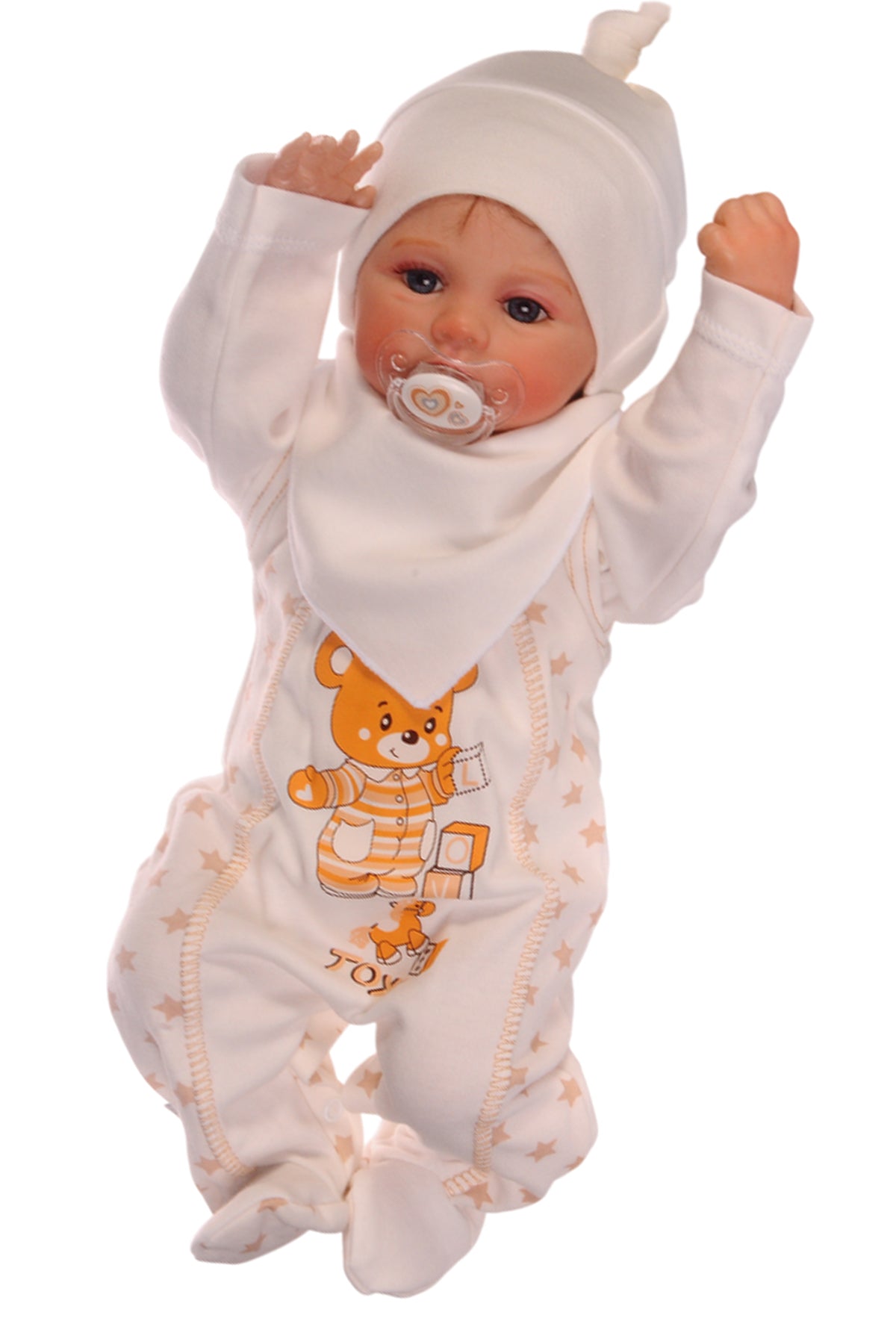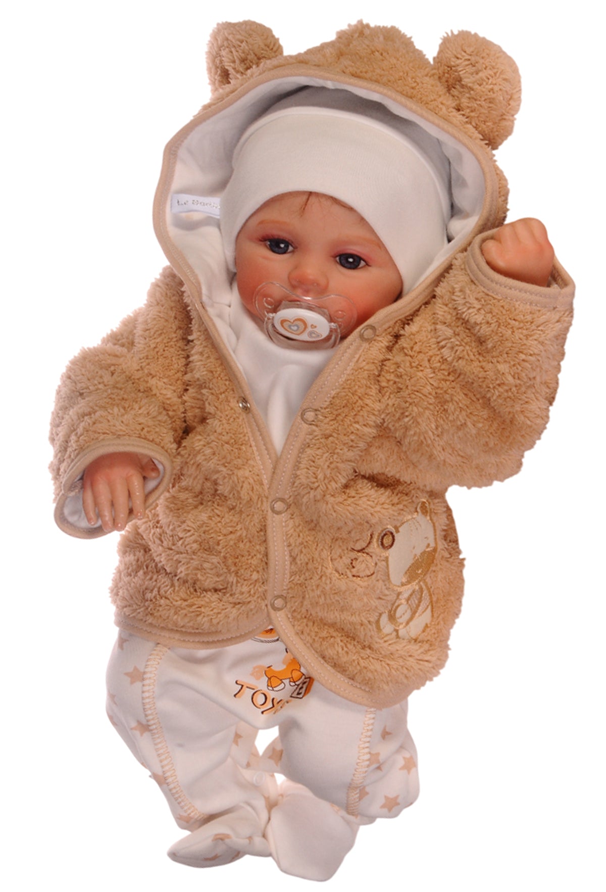 Alle vier Teile sind aus 100 % reiner Baumwolle gefertigt, wodurch sie besonders weich, atmungsaktiv und sanft zu empfindlicher Babyhaut sind. Abgerundet wird das Set durch eine kuschelige, doppellagige Fleecejacke mit Kapuze – außen aus 100 % Polyester Softfleece in Beige mit liebevoll gesticktem Bärchen-Motiv, innen mit einem Futter aus 100 % Baumwolle in Creme, das für ein angenehmes Tragegefühl sorgt.