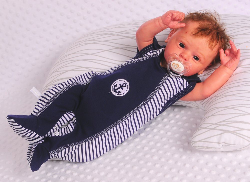Der Strampler in dezentem Blau-Weiß gestreift ist mit einer feinen Anker-Stickerei versehen – ein stilvoller Hingucker mit maritimem Charme. Das Hemdchen lässt sich dank praktischer Druckknöpfe seitlich öffnen, sodass kein Über-den-Kopf-Ziehen nötig ist. Die weiche Mütze mit Bindeband schützt das kleine Köpfchen und hält es angenehm warm.