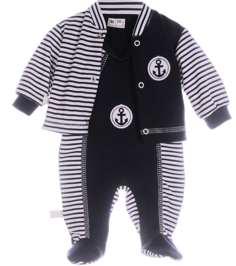 Baby-Strampler Set 3-teilig – Blau gestreift mit Anker-Stickerei – Strampler, Hemdchen & Mütze – aus reiner Baumwolle – unisex
